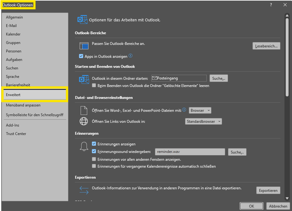 Datei > Optionen > Erweitert klicken