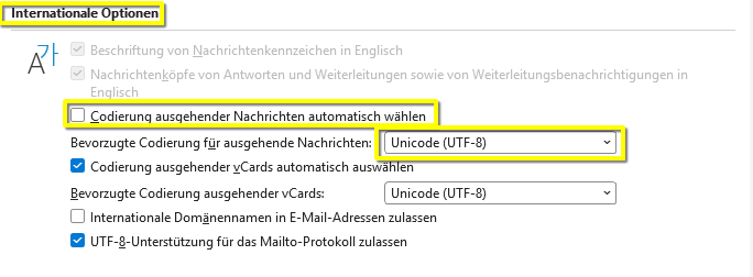 Bei „Bevorzugte Codierung für ausgehende Nachrichten “ im Dropdown-Menü Unicode (UTF-8) auswählen.