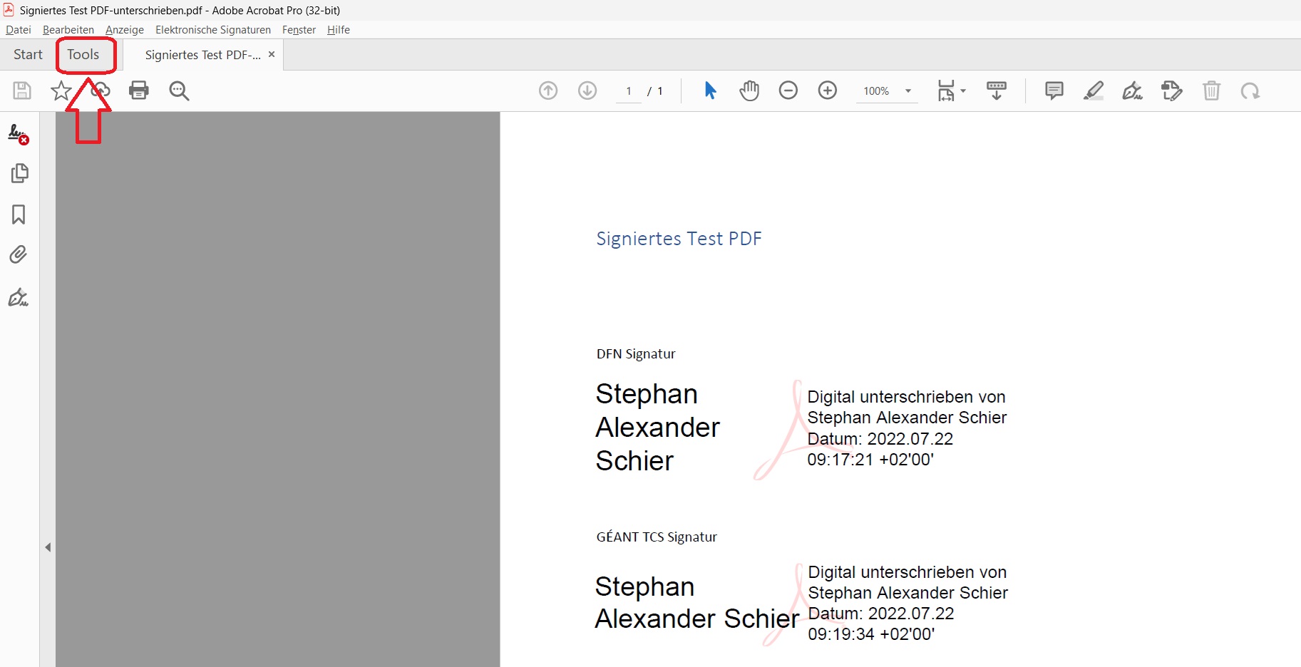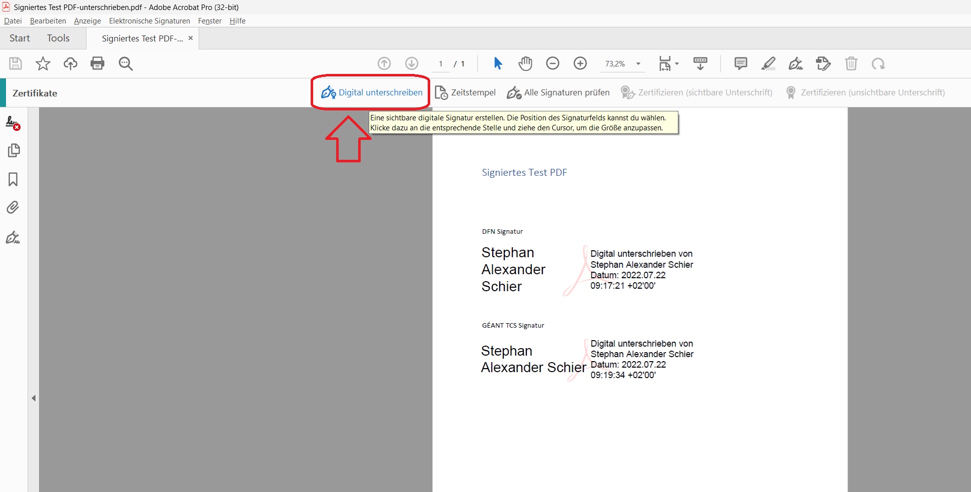 Sie können auch mit Ihrem Zertifikat (=mit Ihrer digitalen ID) in PDF-Dokumenten unterschreiben, welche kein vor-definiertes Unterschriften-Feld besitzen. Stellen Sie dazu sicher, dass Sie Ihr Nutzer-Zertifikat ins System importiert haben und dass Sie dieses Zertifikat in Acrobat nutzbar gemacht haben. Anschließend gehen Sie bitte wie folgt vor: