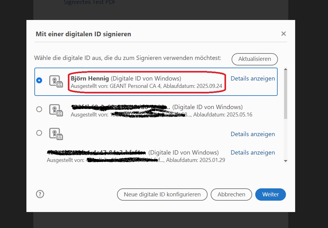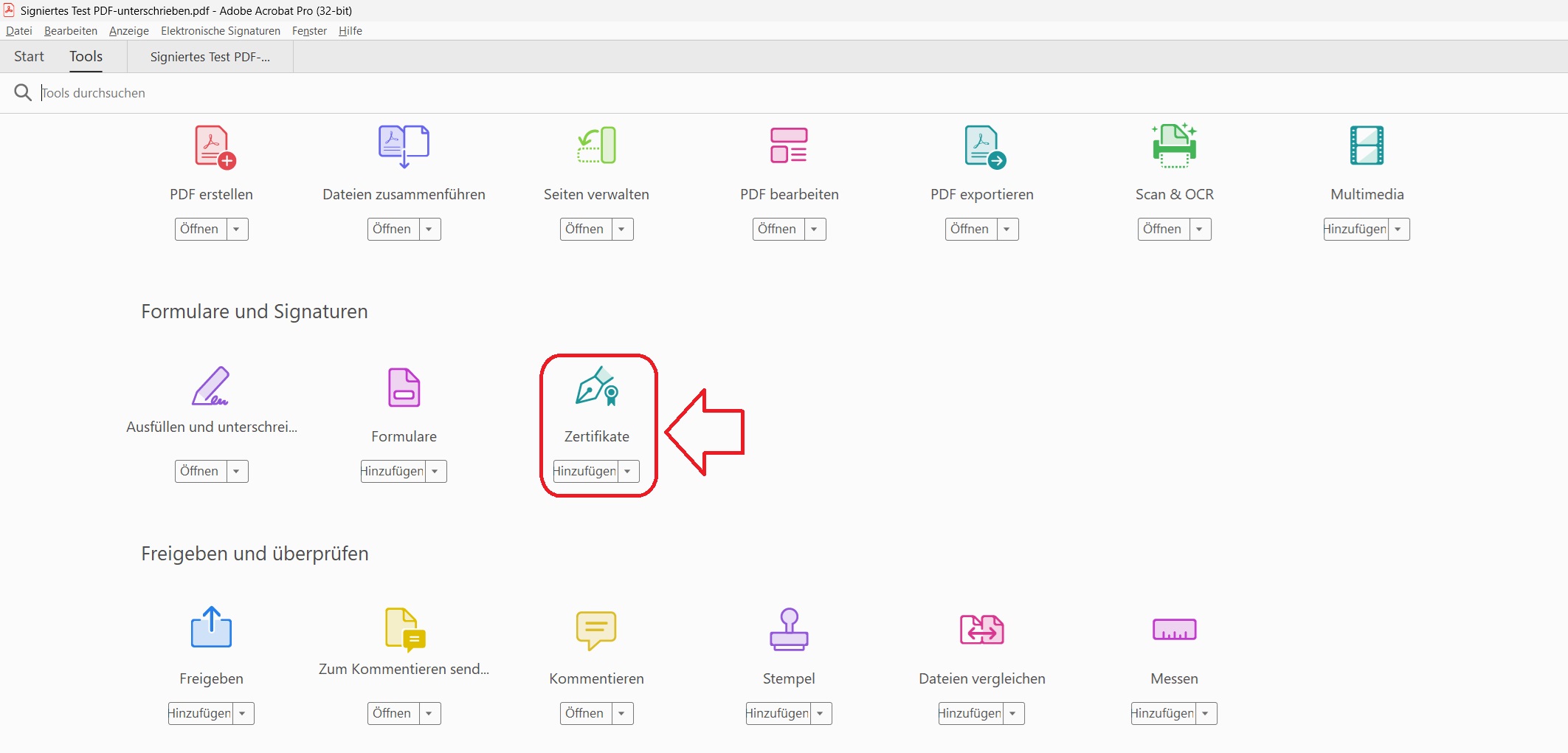 ), in der neuen Acrobat-Ansicht heißt der Punkt mittlerweile "Ein Zertifikat verwenden