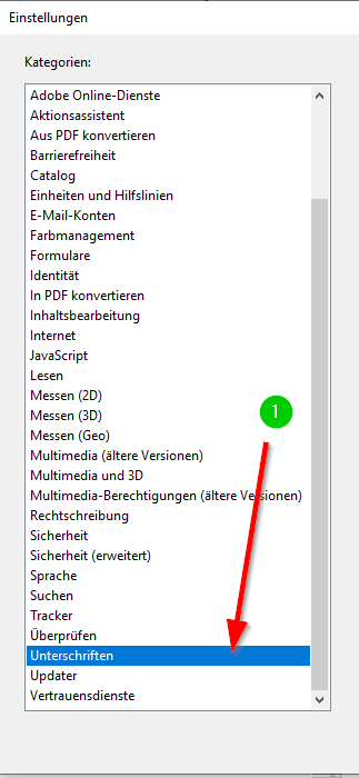 2. Scrollen Sie soweit runter, bis Sie den Punkt "Unterschriften" (1) sehen und klicken diesen an.