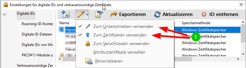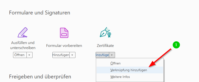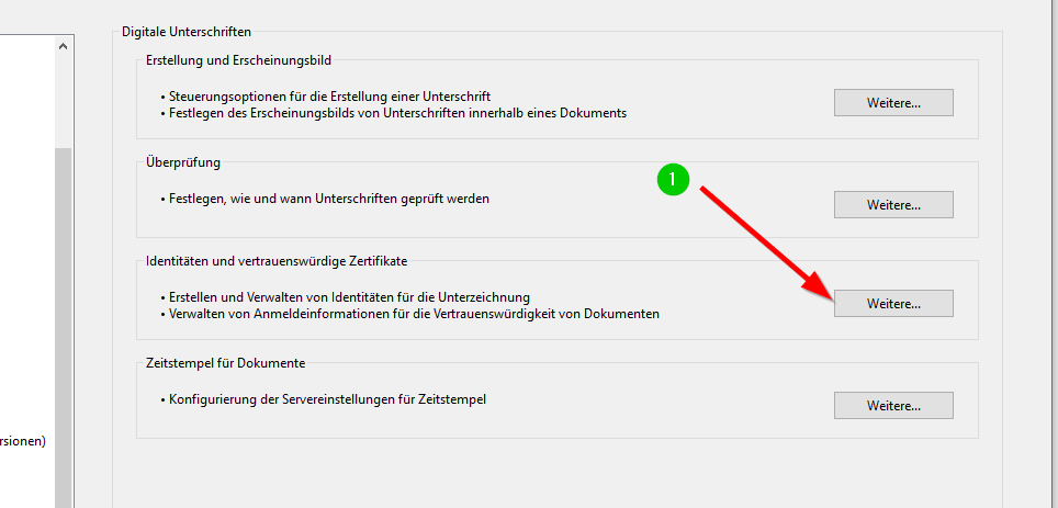 Alternativ kann das Zertifikat auch direkt in Acrobat eingerichtet werden, wenn es nicht in den Zertifikatsspeicher des Betriebsystems importiert werden kann oder soll.