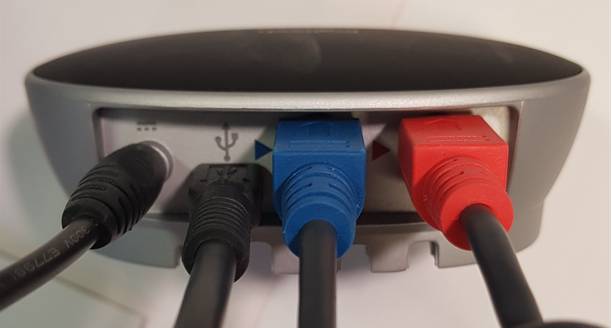 Die Tischstation wird mit dem roten Kabel verbunden.