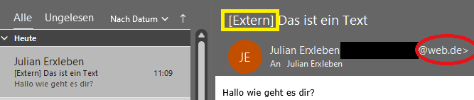 Wenn eine E-Mail von außerhalb der Organisation der Fachhochschule eingegangen ist, wird diese (gelbe Markierung) als [Extern] gekennzeichnet. Obwohl der Name der Person dort steht, ist die E-Mail von einem externen Absender (siehe rote Umrandung) markiert.