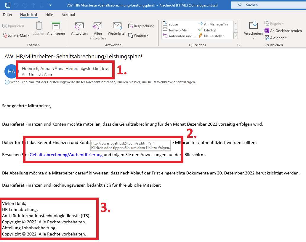 1. Die Absender-Mailadresse anna.heinrich@stud.ku.de ist keine FHP-Mailadresse.