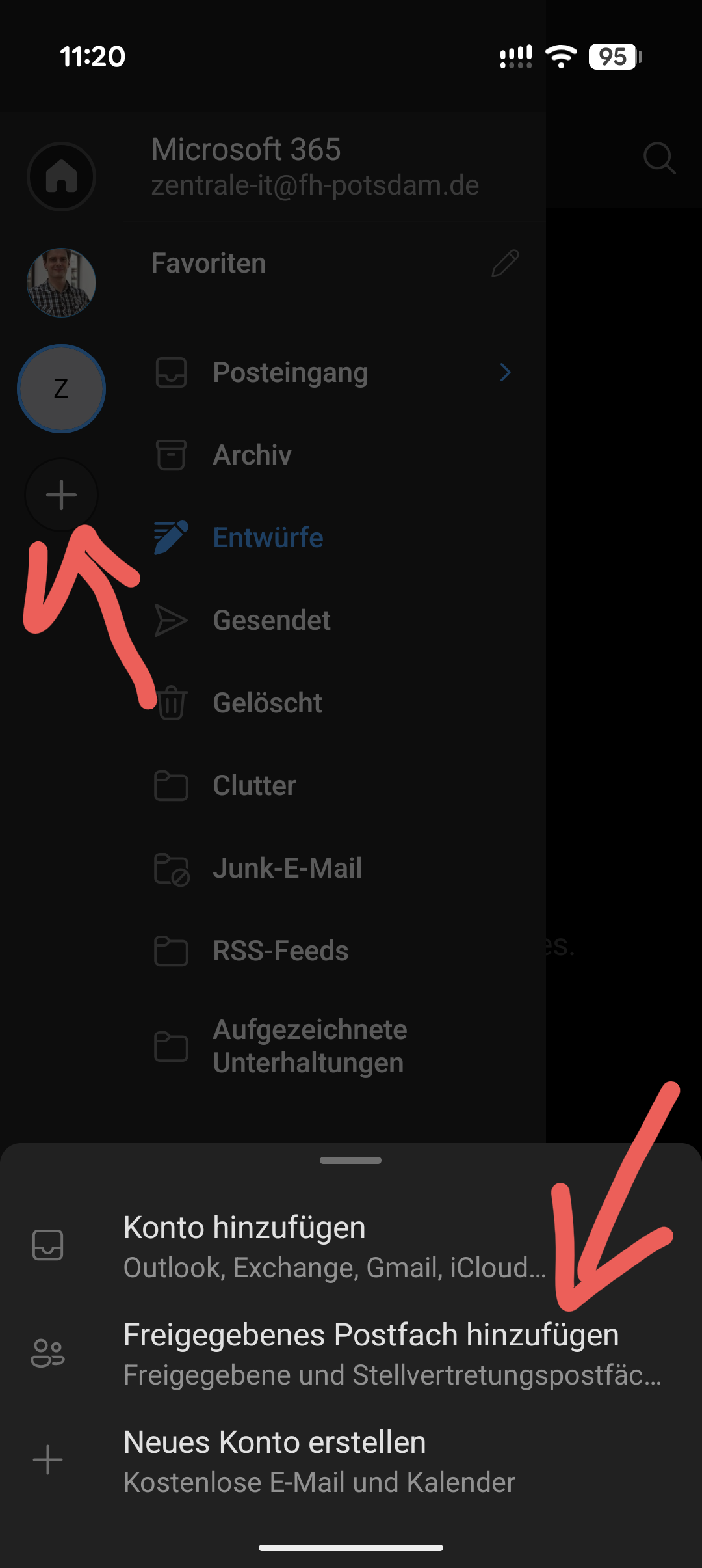 Dann klicken Sie auf das + um ein weiteres Konto hinzuzufügen und wählen dann "Freigegebenes Postfach hinzufügen" aus.
