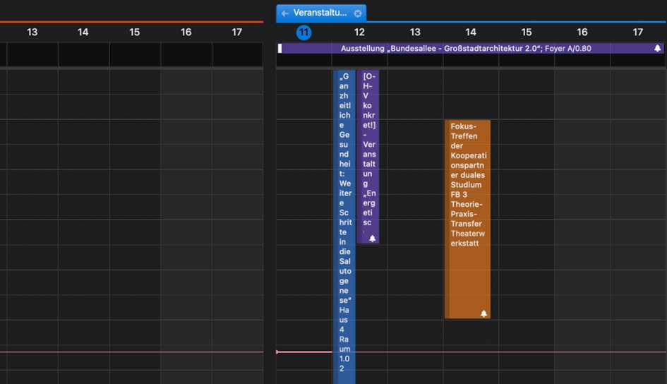 Bestätigen Sie Ihre Suche mit ok. Der Kalender des Veranstaltungsmanagement erscheint in der Ansicht