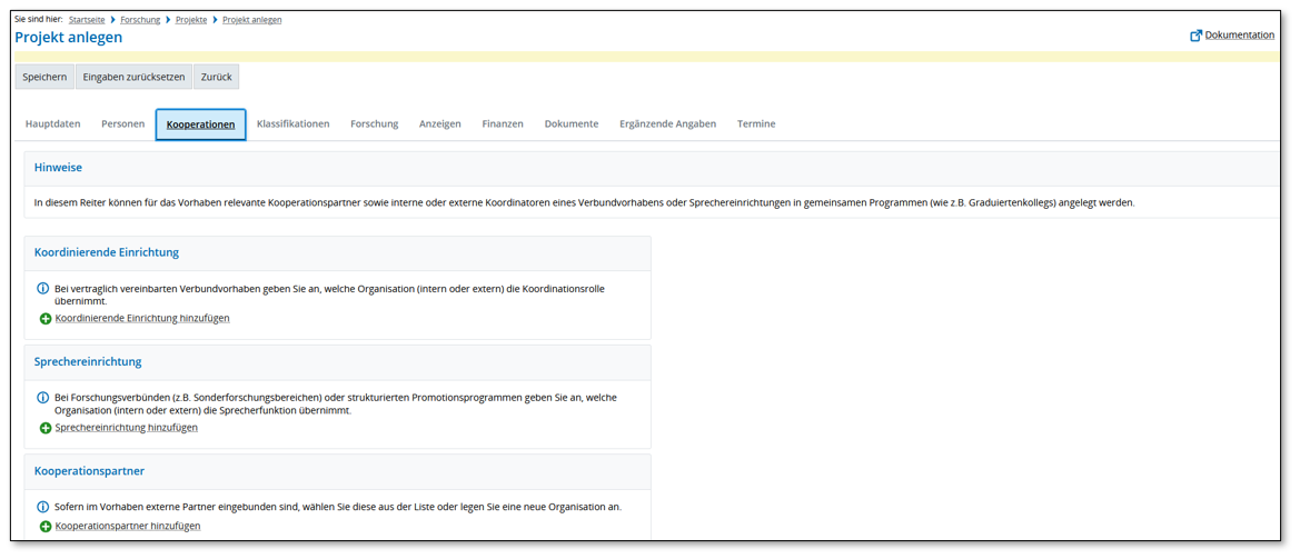 Bei Forschungsverbünden (z. B. Sonderforschungsbereichen) oder strukturierten Promotionsprogrammen erfassen Sie hier den Namen der Sprechereinrichtung. Ordnen Sie hierfür dem Projekt eine interne Organisationseinheit oder eine externe Organisation zu. Für die Auswahl stehen die gleichen Varianten wie bei der Koordinierenden Einrichtung zur Verfügung (s. o.).