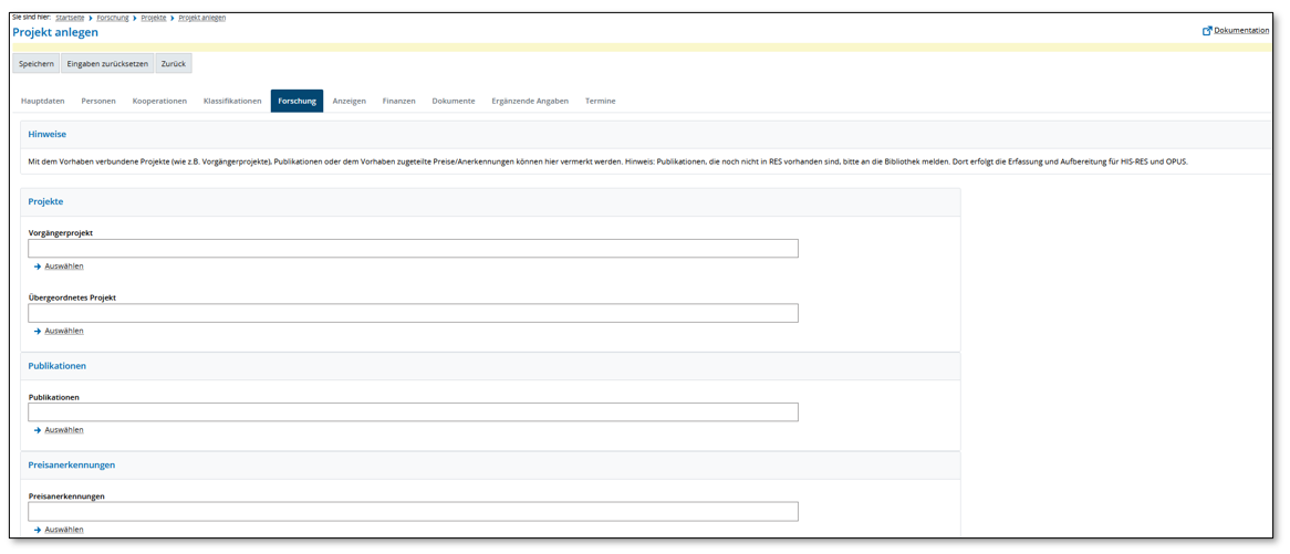 Im Reiter "Forschung" können Sie mit dem Vorhaben verbundene Projekte, Publikationen und/oder dem Vorhaben zugeteilte Preise bzw. Anerkennungen angeben. Voraussetzung dafür ist, dass diese in HIS-RES bereits angelegt sind.