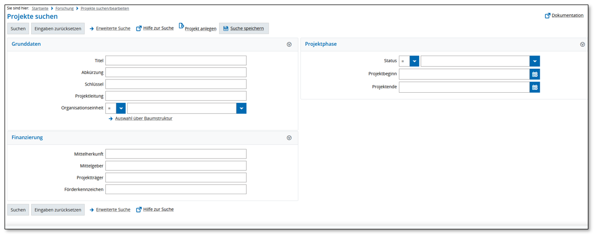Klicken Sie auf Erweiterte Suche, um Informationen zum Projekt, zur Publikation oder Preisanerkennung im Feld "Grunddaten" einzugeben. Wählen Sie aus der generierten Liste den gewünschten Eintrag aus.