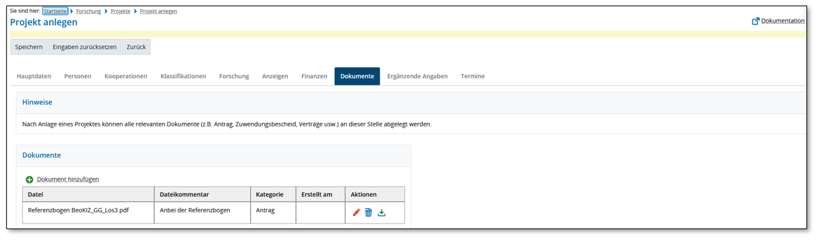 Bitte beachten Sie, dass bei der Neuanlage eines Projektes dieses zunächst gespeichert werden muss, bevor ein Dokument hinzugefügt werden kann.