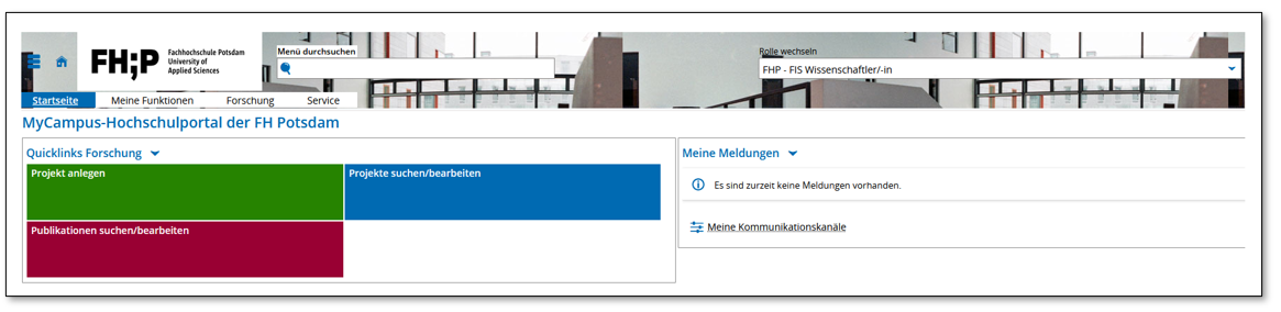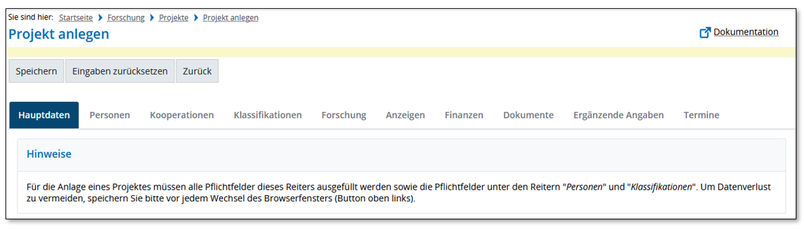 Hinweis: Die Eingabe der Daten für die Reiter Hauptdaten, Personen und Klassifikationen ist Voraussetzung für das Speichern bzw. das Anlegen des Projekts im FIS. Die Speicherfunktion finden Sie oben links in der Eingabemaske.