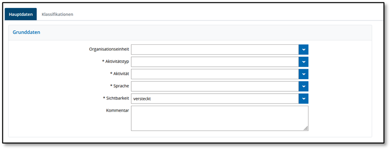 Abhängig vom Aktivitätstyp werden verschiedene Aktivitäten als Drop-down-Liste zur Verfügung gestellt. Abhängig von der Aktivität erscheinen weitere Felder zur Eingabe zusätzlicher Informationen zur Aktivität.