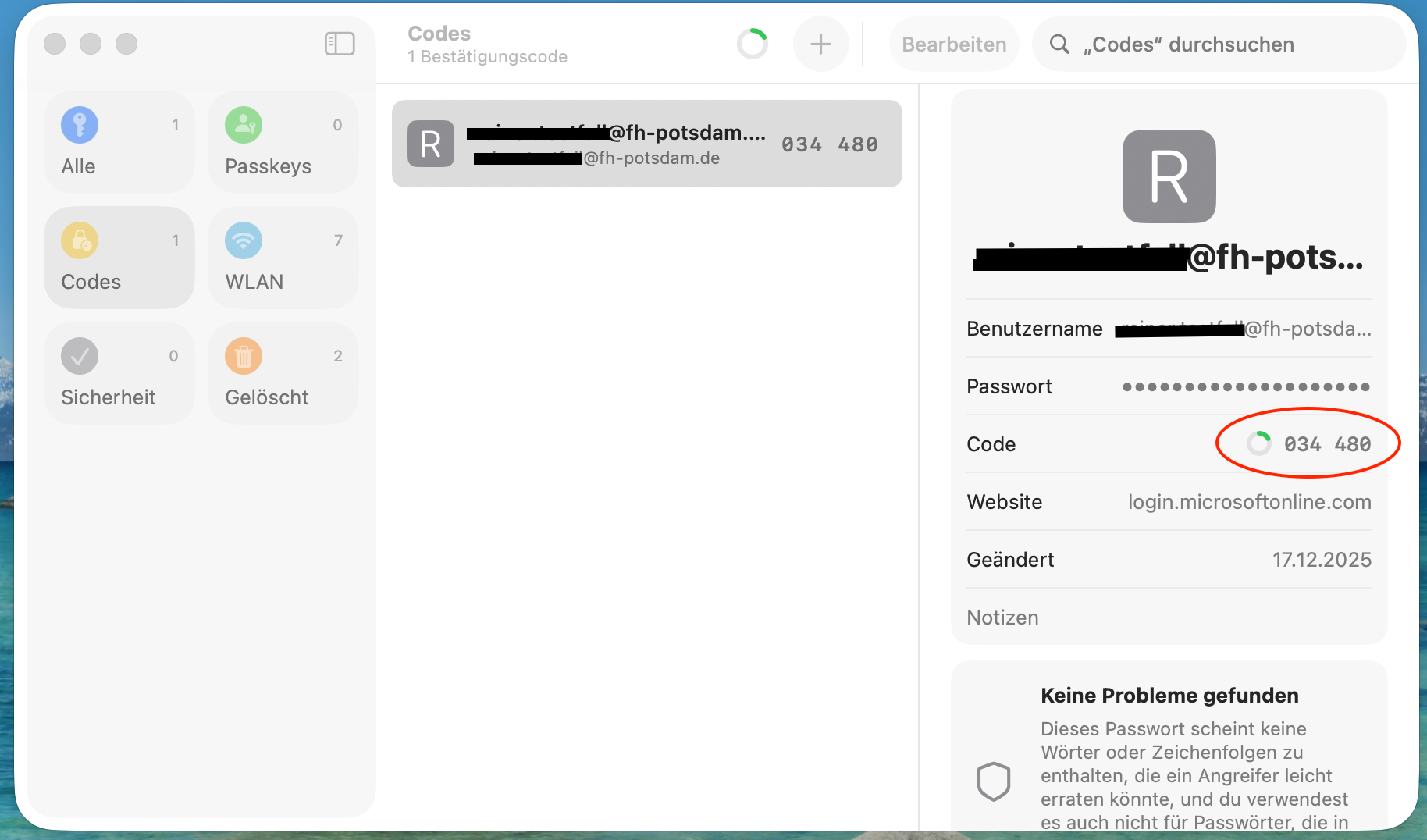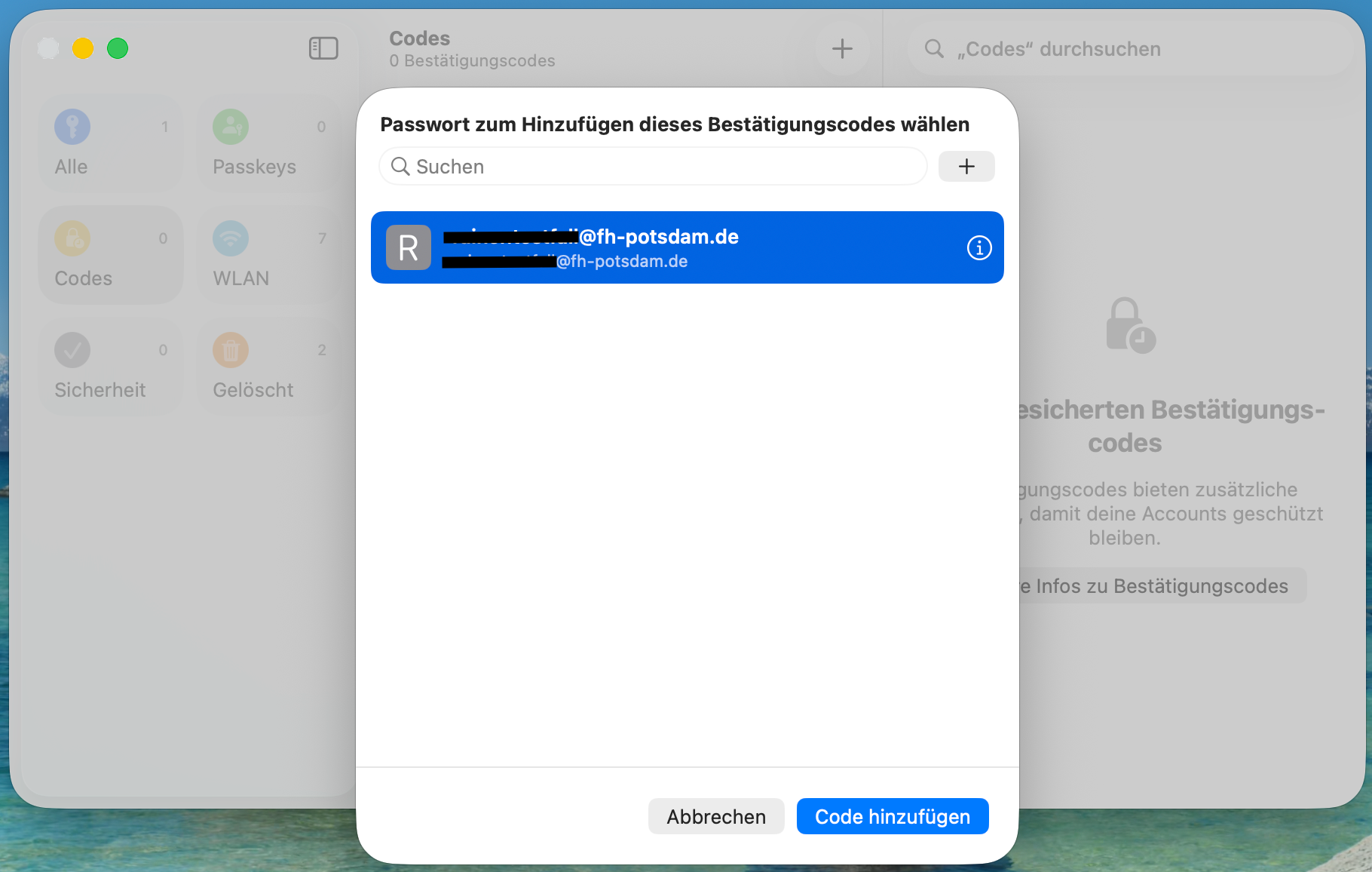 7. Öffnen Sie Passwörter auf Ihrem Mac oder Apple Mobil Gerät. Dort gehen Sie auf Codes und dann auf das "+" um einen neuen Code hinzuzufügen.