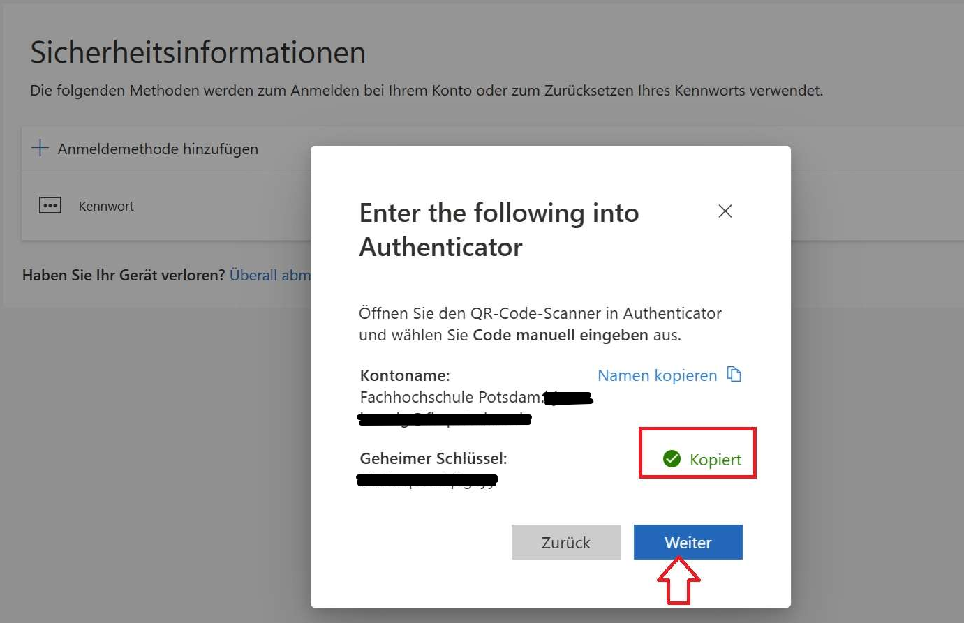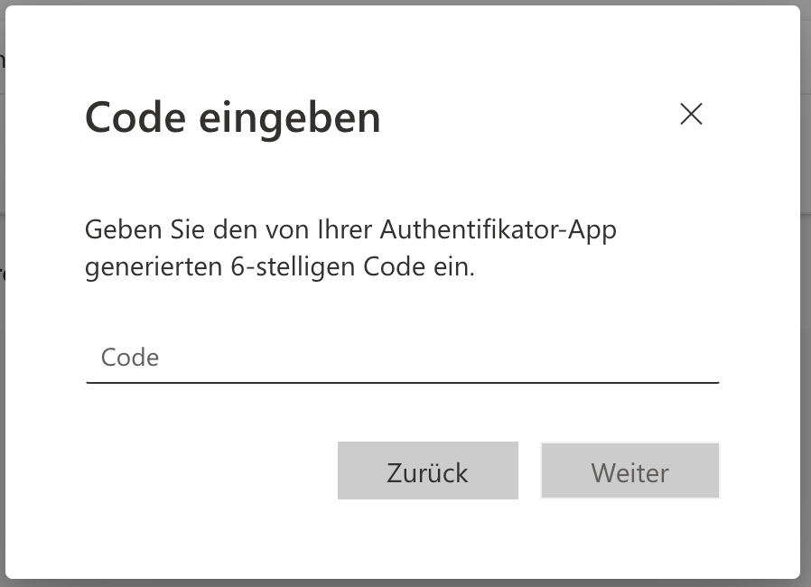 Sie werden jetzt aufgefordert den Code einzugeben. Fügen Sie den im vorherigen Schritt kopierten Code ein und klicken Sie auf weiter.