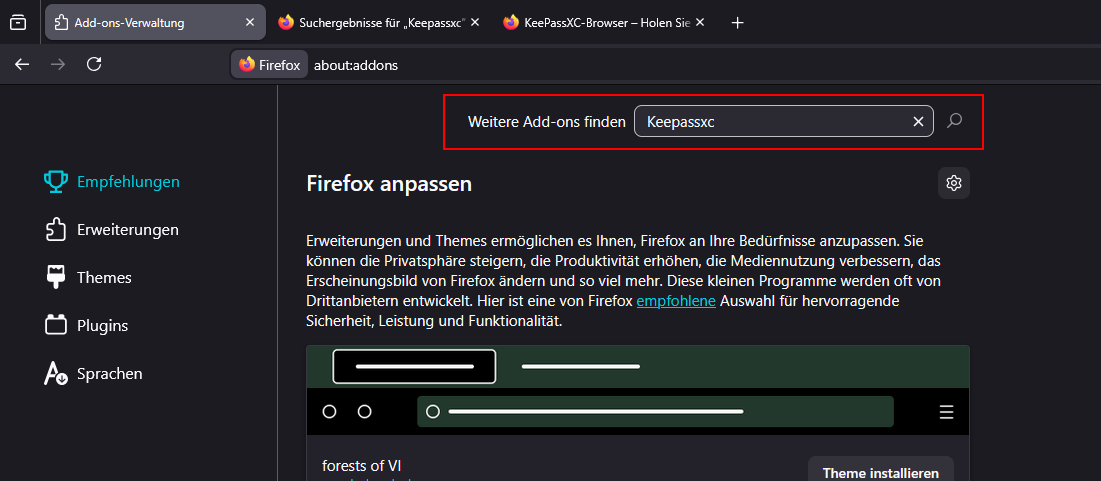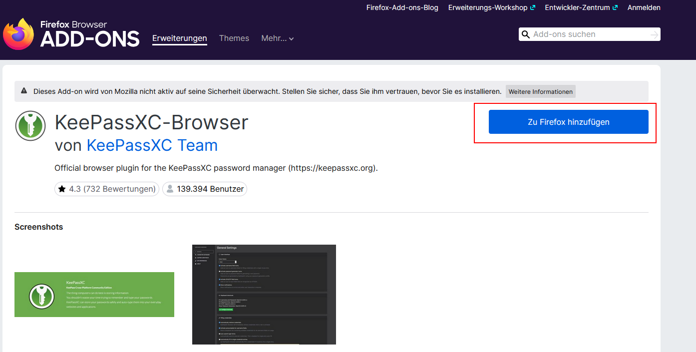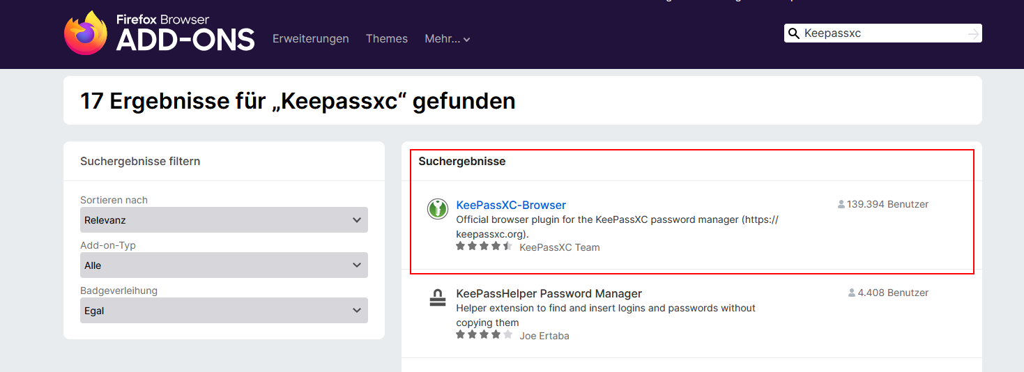 In den Suchergebnissen die Erweiterung „KeePassXC-Browser“ auswählen.