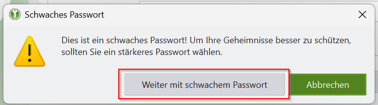 Die Passwörter können trotzdem genutzt werden, indem man auf "Weiter mit schwachem Passwort" klickt.
